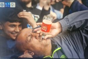 体育资讯04月13日讯 英超第32轮,曼城客场3-0完胜切尔西。比赛过程中转播镜头对准了看台上的一位曼城球迷,他拿着印有阿森纳标志的水瓶疯狂嘲讽庆祝,瞬间走红。