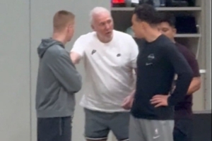 今日,马刺传奇教练波波维奇现身球队训练场,并在场上指导现任主帅米奇。